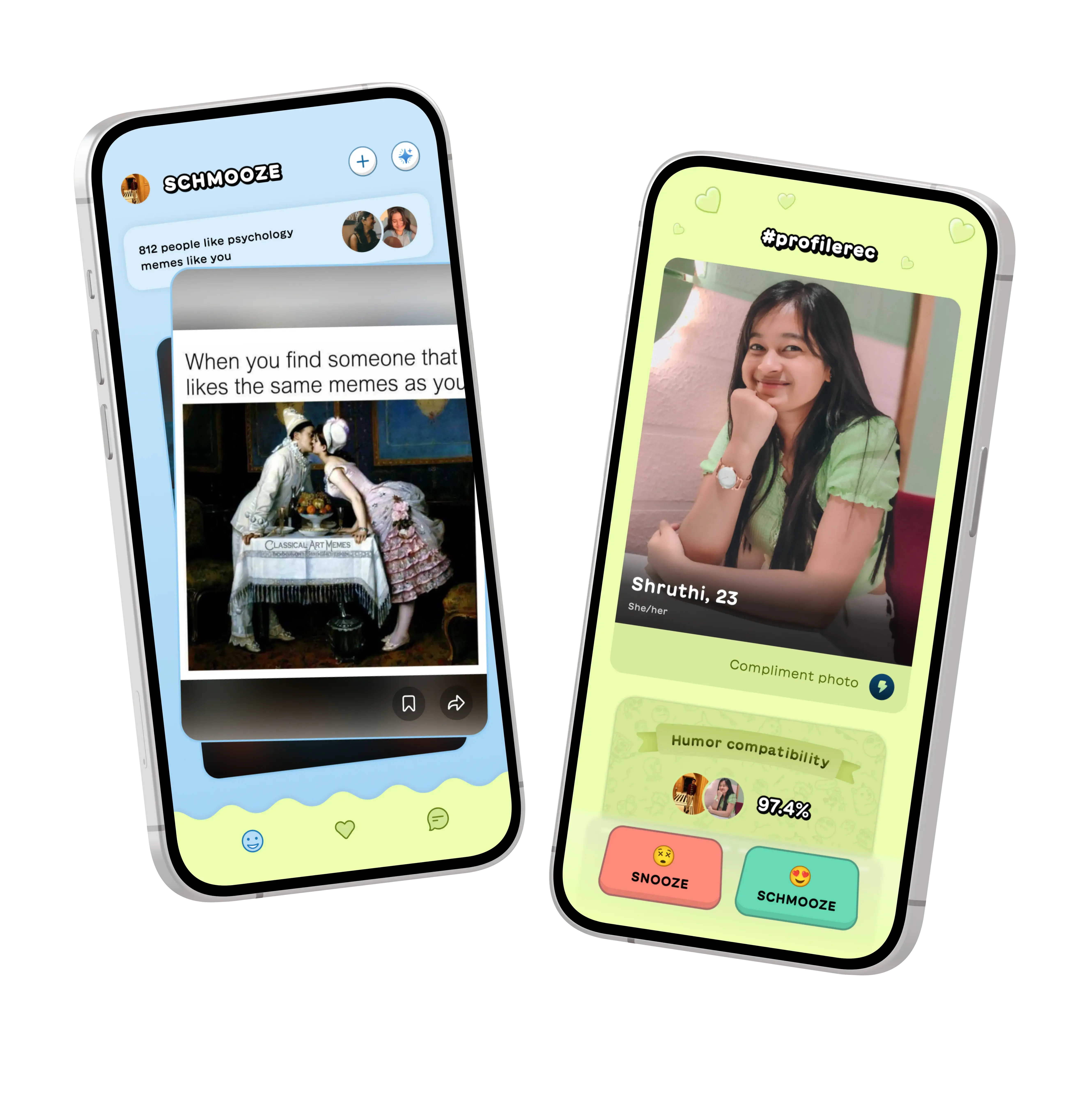 “Dating app Schmooze, where you swipe through someone's funny memes rather than stagnant selfies”